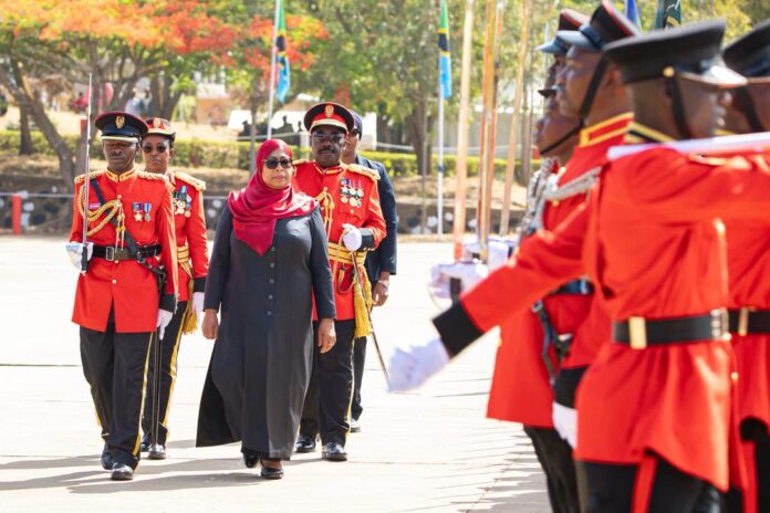 Amiri Jeshi Mkuu wa Majeshi ya Ulinzi na Usalama na Rais wa Jamhuri ya Muungano wa Tanzania Dk. Samia Suluhu Hassan akikagua Gwaride Maalumu la kuwatunuku Kamisheni Maafisa wa Jeshi la Wananchi wa Tanzania (JWTZ) kwenye hafla iliyofanyika katika Chuo cha Kijeshi Monduli Mkoani Arusha leo Novemba 22, 2025.