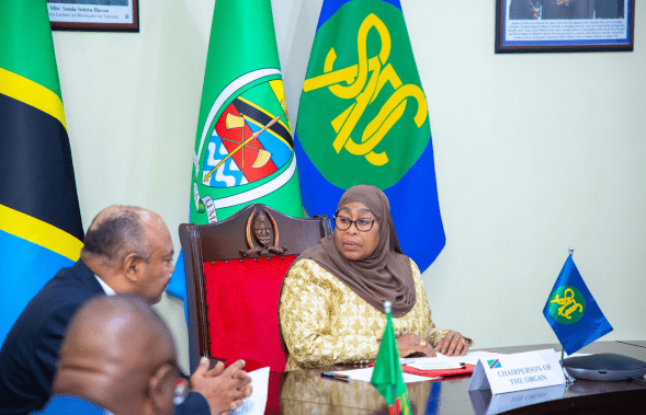 Rais wa Jamhuri ya Muungano wa Tanzania ambaye pia ni Mwenyekiti wa Asasi ya Siasa, Ulinzi na Usalama ya Jumuiya ya Maendeleo Kusini mwa Afrika (SADC-Organ) Dkt. Samia Suluhu Hassan akiongoza Mkutano wa Dharura wa Wakuu wa Nchi na Serikali wa Asasi hiyo uliofanyika Ikulu Jijini Dar es Salaam leo tarehe 28 Januari, 2025.