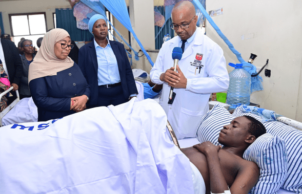 Rais wa Jamhuri ya Muungano wa Tanzania Dk. Samia Suluhu Hassan akiwajulia hali na kuwapa pole majeruhi wa ajali ya kuporomoka kwa ghorofa Kariakoo ambao wamelazwa katika Taasisi ya Tiba ya Mifupa Muhimbili (MOI), Ilala Jijini Dar es Salaam leo Novemba 20,2024.