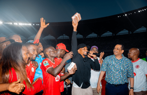 Naibu Waziri wa Habari, Utamaduni, Sanaa na Michezo Hamis Mwinjuma akimkabidhi nahodha wa timu ya Simba SC, Mohamed Hussein ‘Zimbwe Jr’ milioni 30 ikiwa ni ahadi ya Rais Dkt. Samia Suluhu Hassan, kwa timu za Tanzania zinazoibuka na ushindi kwenye mashindano ya Kimataifa, ambapo jana April 9, 2025 kwenye mchezo wa robo fainali ya Kombe la shirikisho Afrika, Simba imewaondoa timu Al Masry ya kutoka Misri kwa Mikwaju ya penati (4- 1).