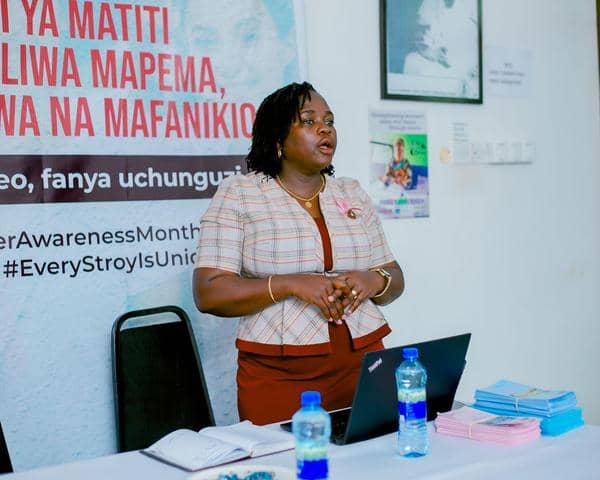 She described breast cancer as one of the most common cancers among Tanzanian women, caused by abnormal cell growth in breast tissue. Key risk factors include early menstruation, not having children, lack of breastfeeding, obesity, smoking, excessive alcohol consumption, and hereditary history of the disease.